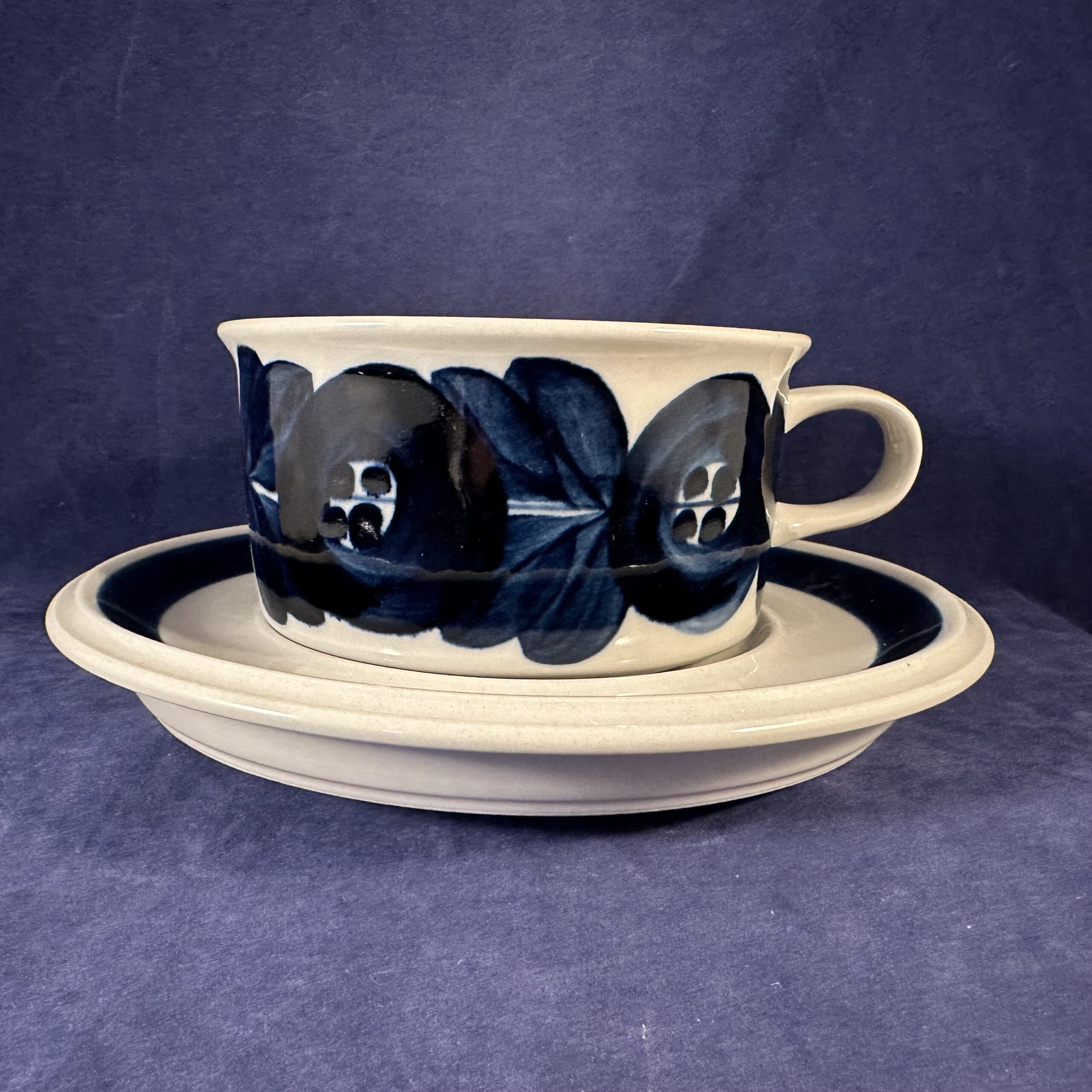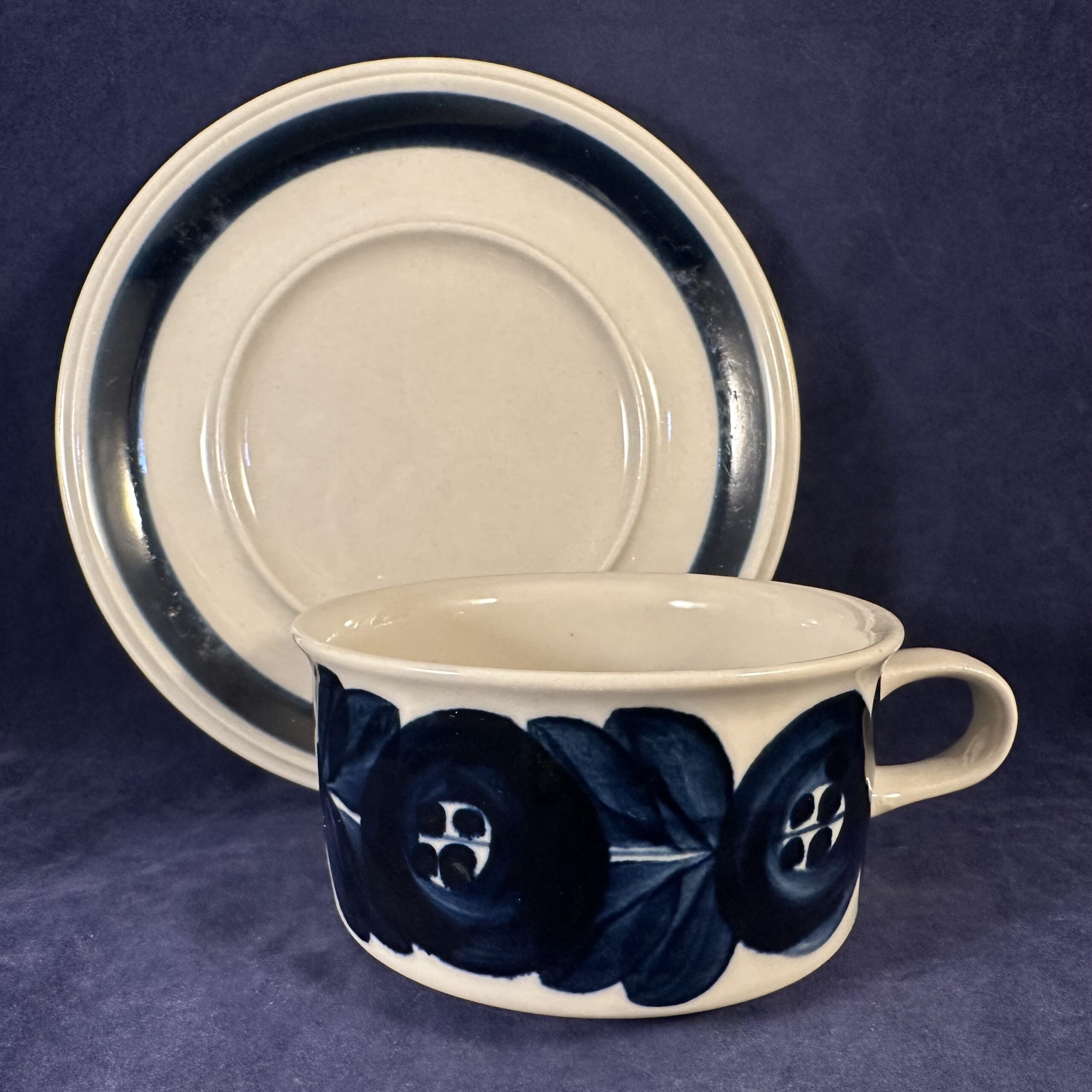 Arabia Finland ‘Anemone’ handgeschilderde kop en schotel, gesigneerd Ulla Procope (blauw), hoog 5,5 cm Ø 10 cm