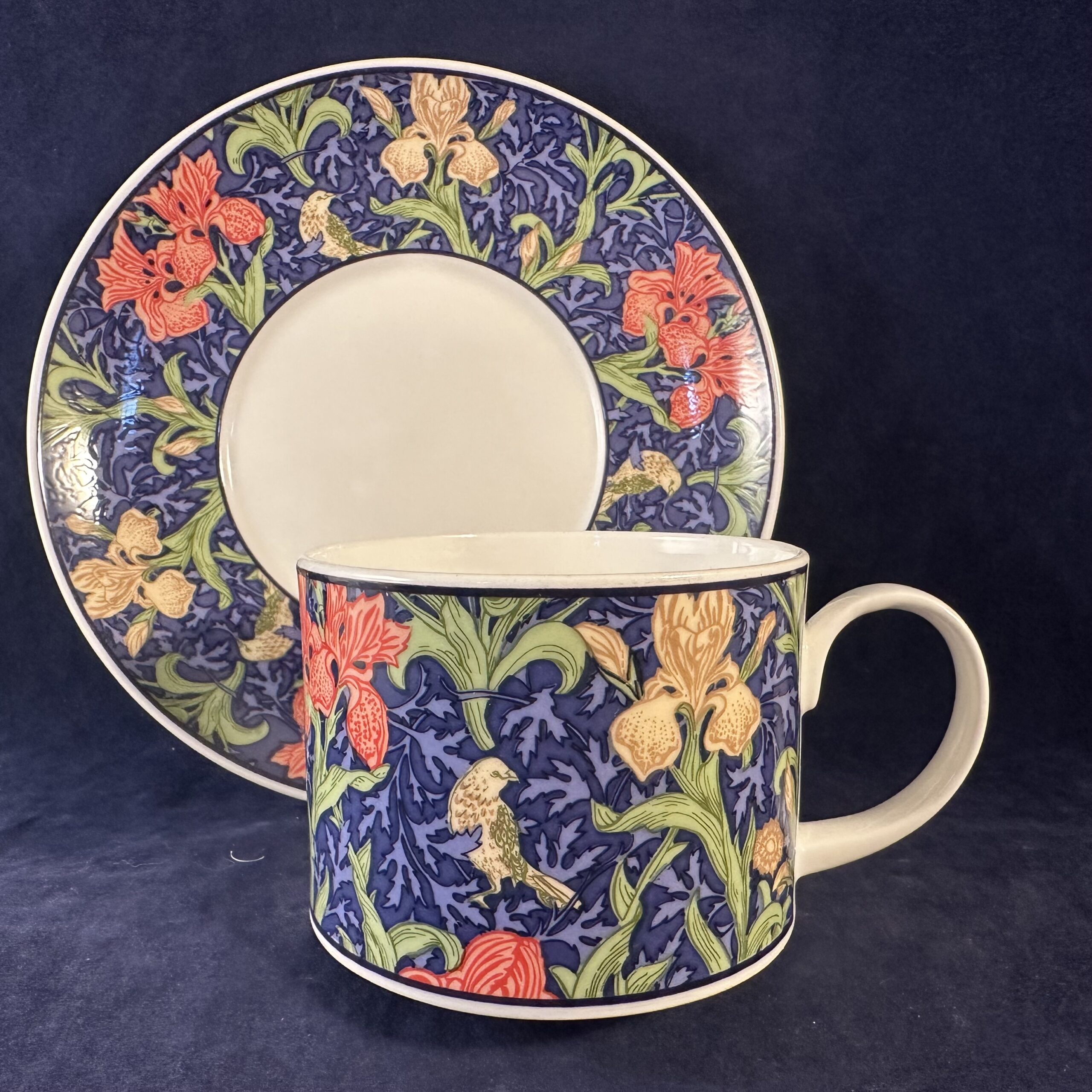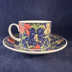 Dunoon kop en schotel met irissen hoog 6 cm Ø 8 cm, ‘Iris’ adapted from William Morris designs