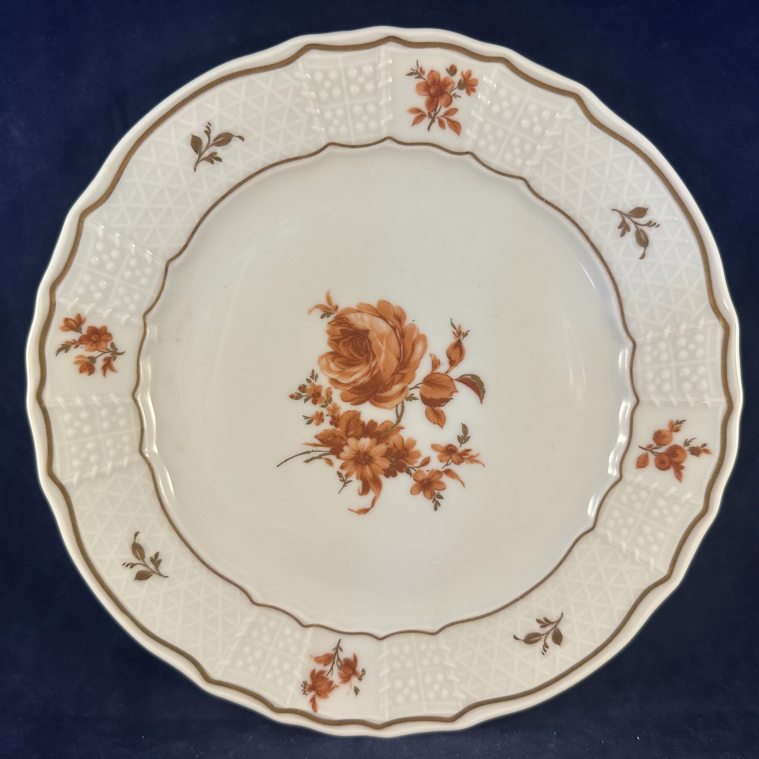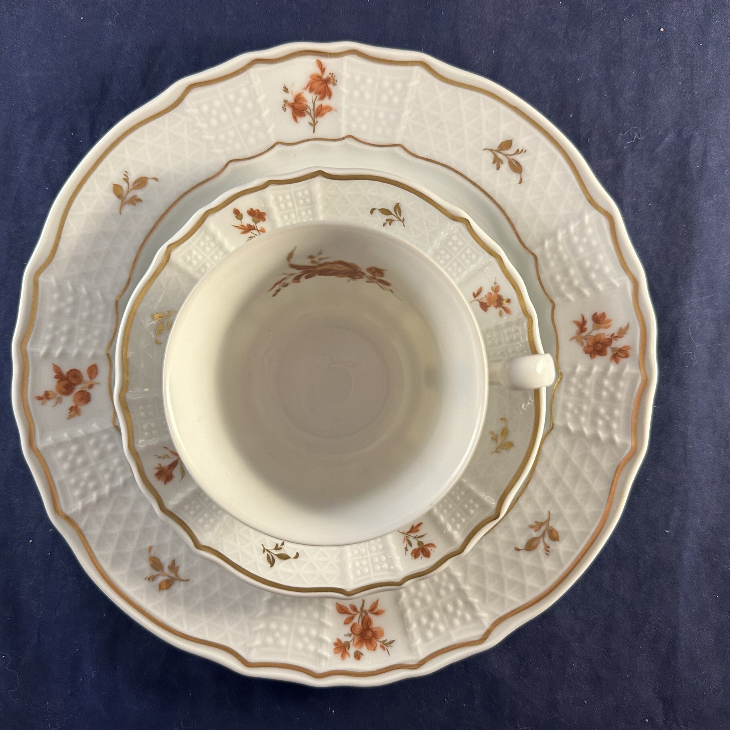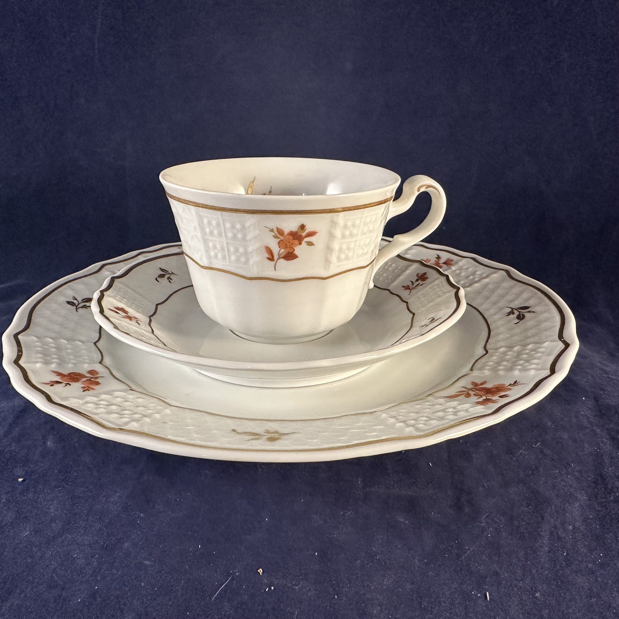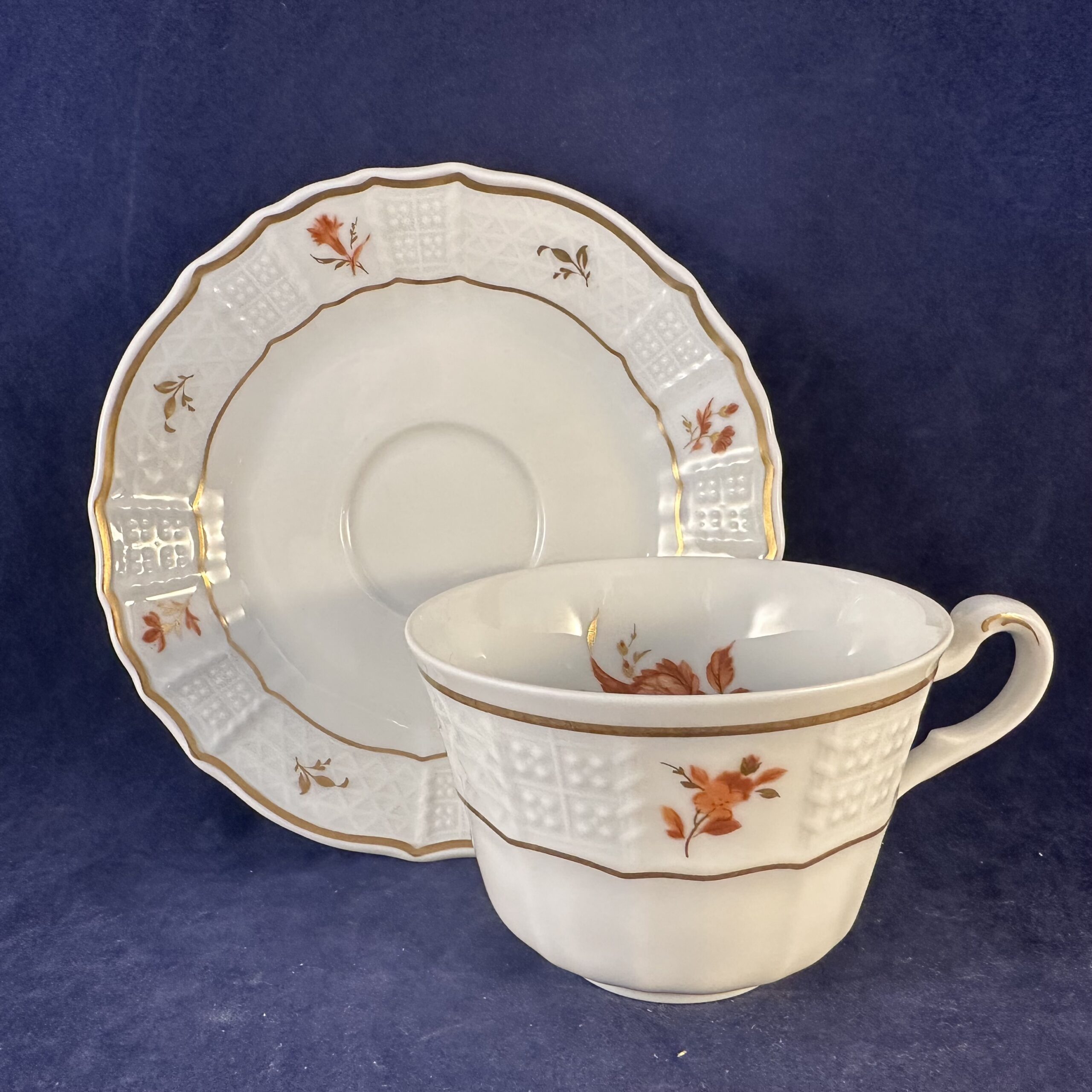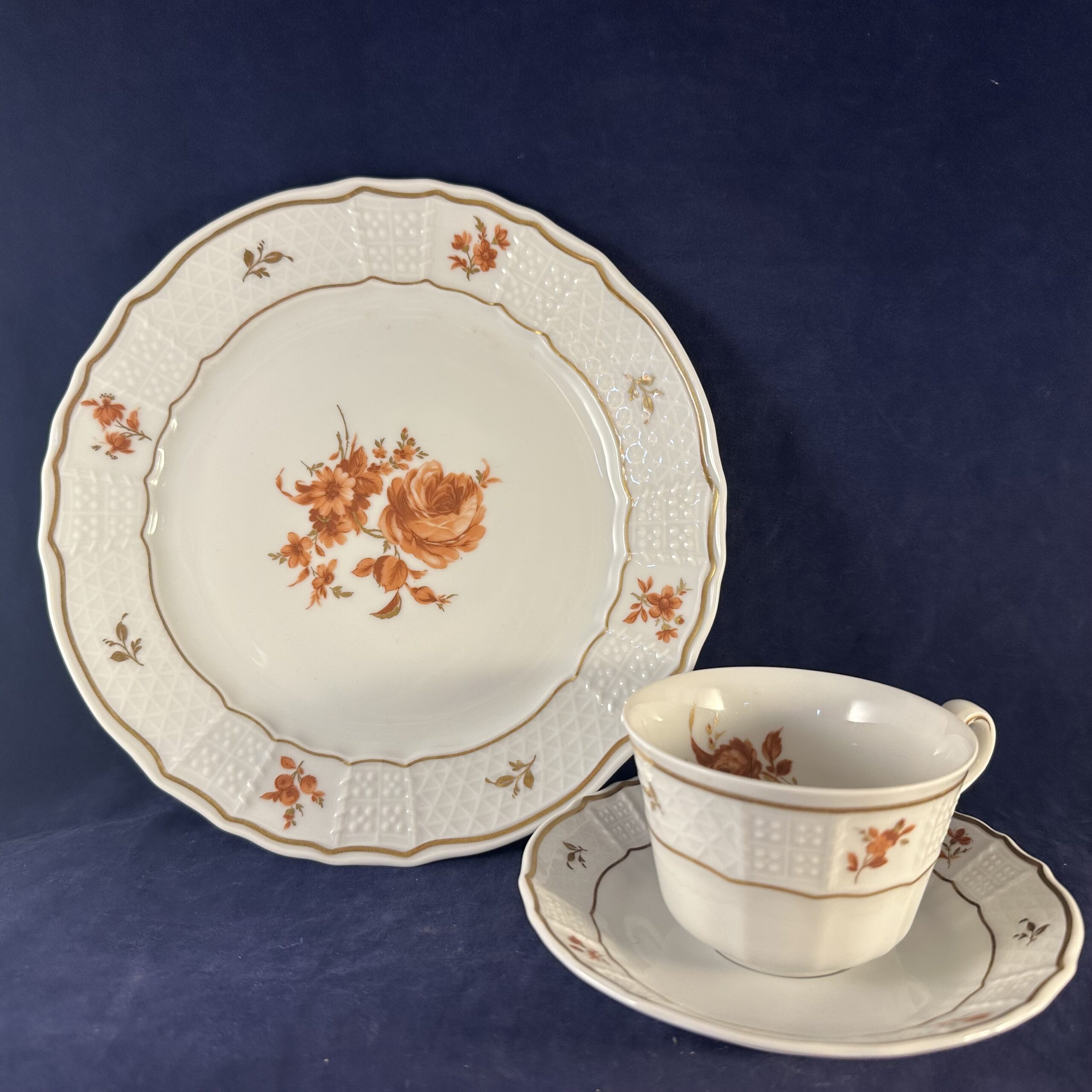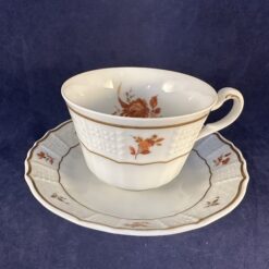 Heinrich ‘Alegre’ ontbijtsetje bestaande uit bord, kop en schotel met roestrood/ goud motief, hoog 5,4 cm, Ø kopje 8 cm Ø bord 20 cm.