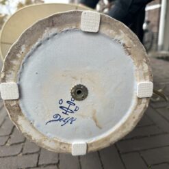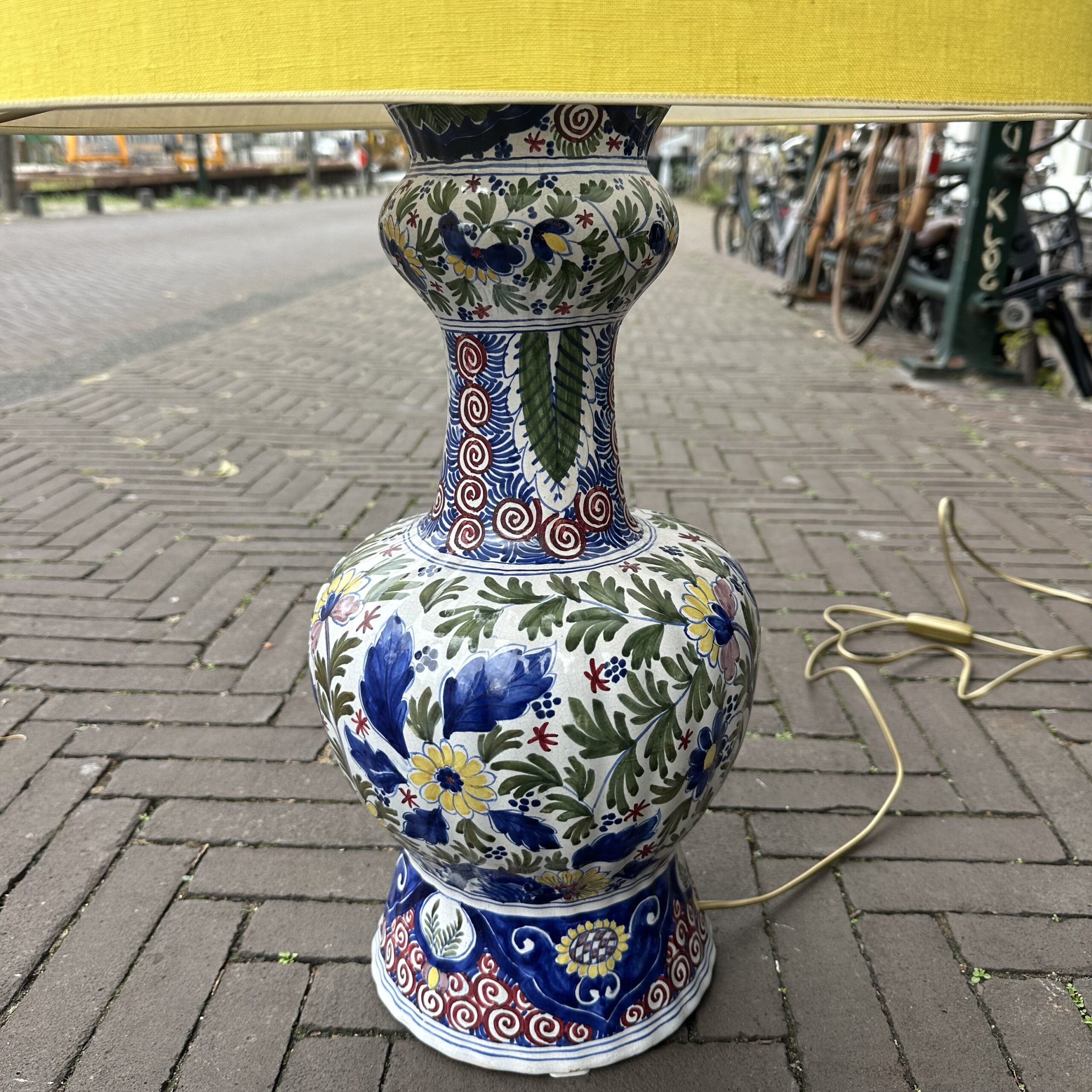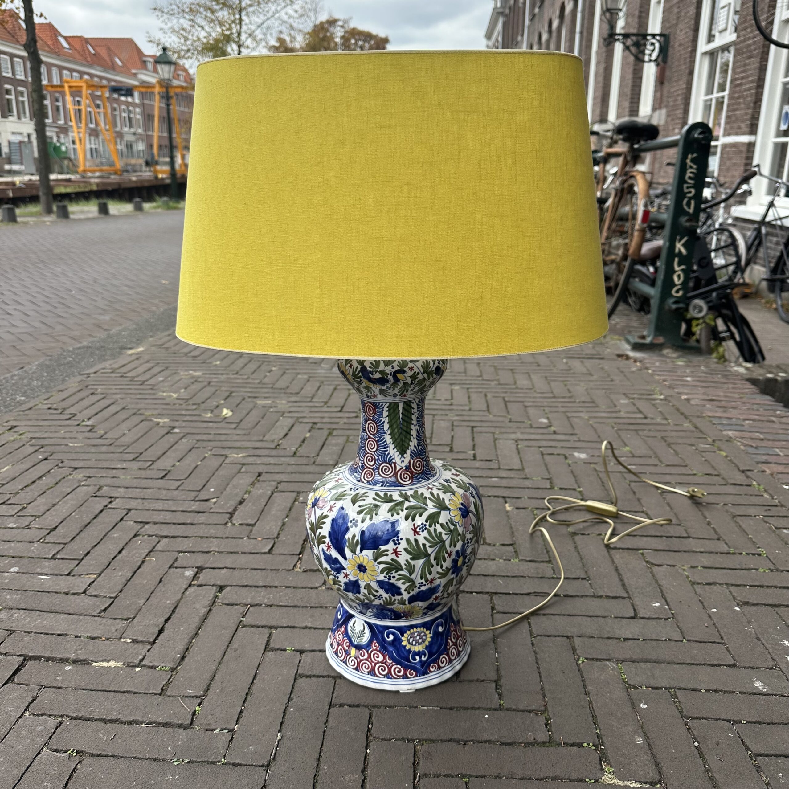 Antieke lamp op Oud Delftse voet (vaas) handgeschilderd polychroom decor, gemaakt bij de Delftse aardewerkfabriek Oude Delft, hoogte tot fitting 45 cm, inclusief op maat gemaakte gele kap.