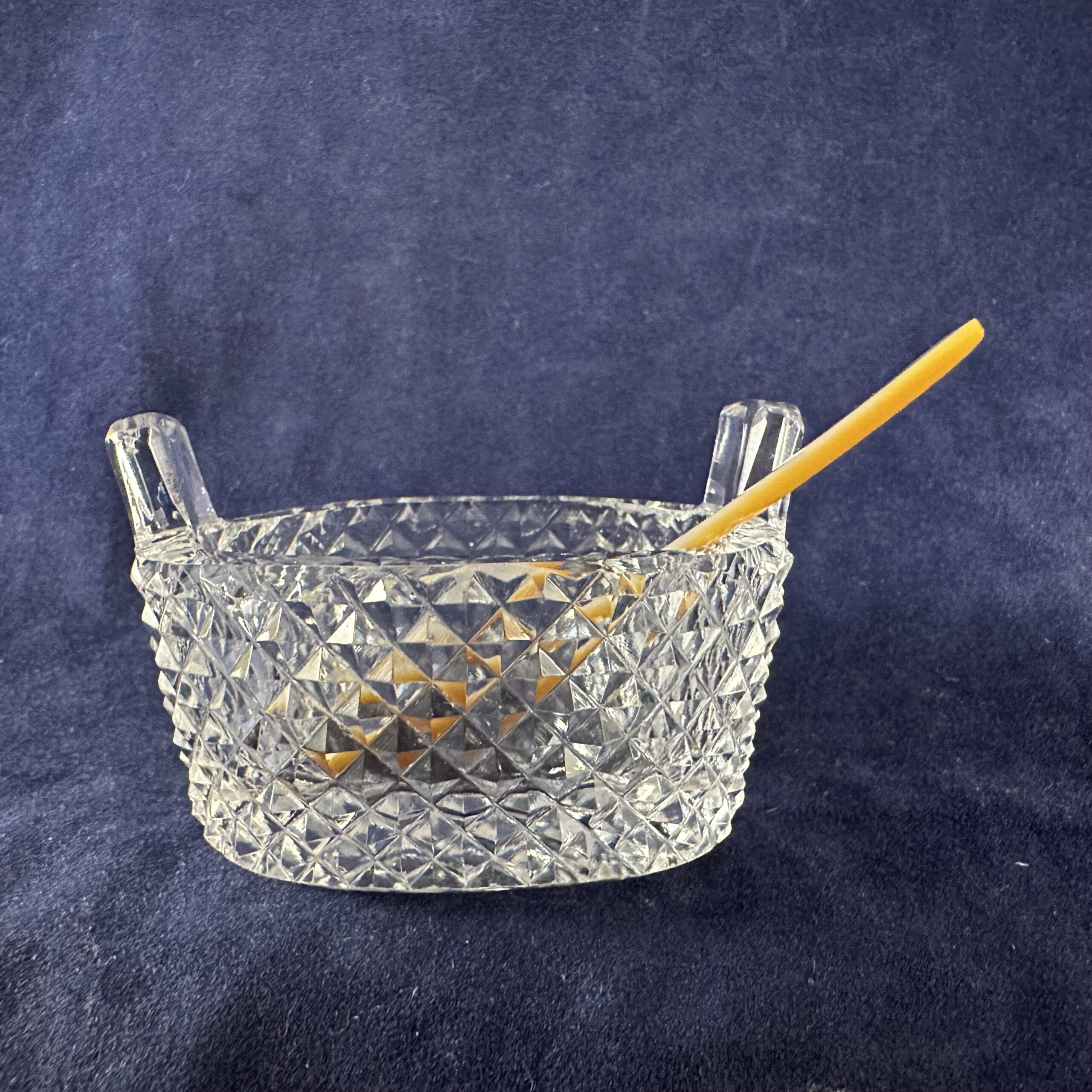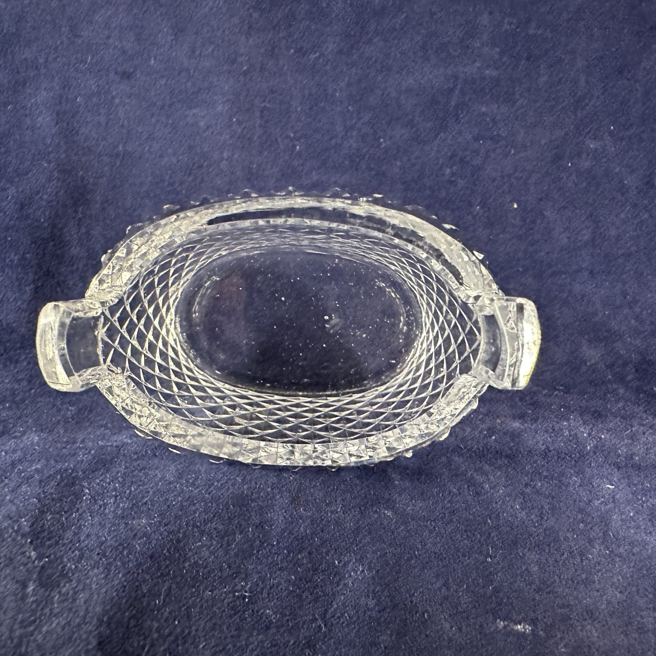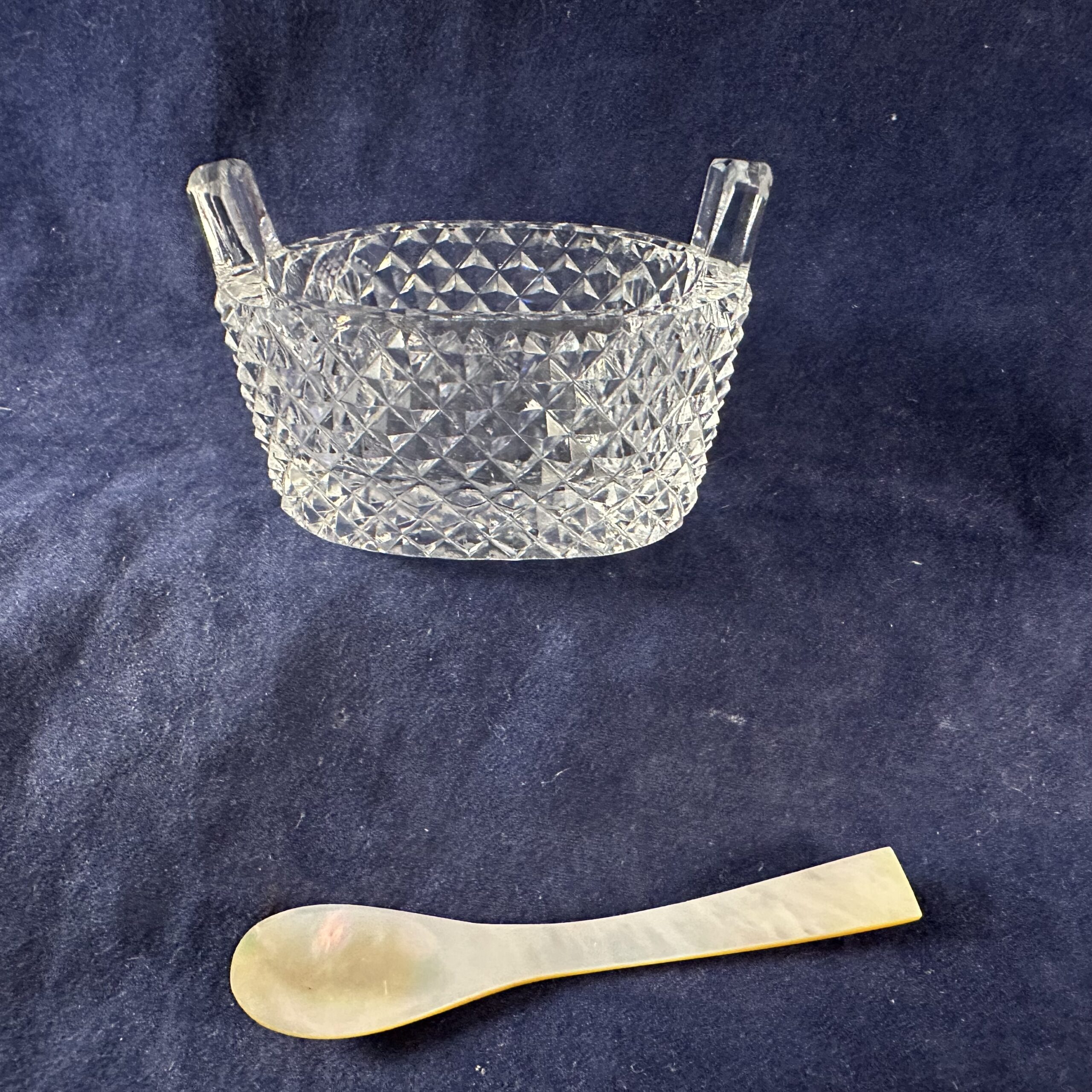 Ovaal geslepen kristallen zoutbakje met parelmoeren schepje. 5 x 3 cm.