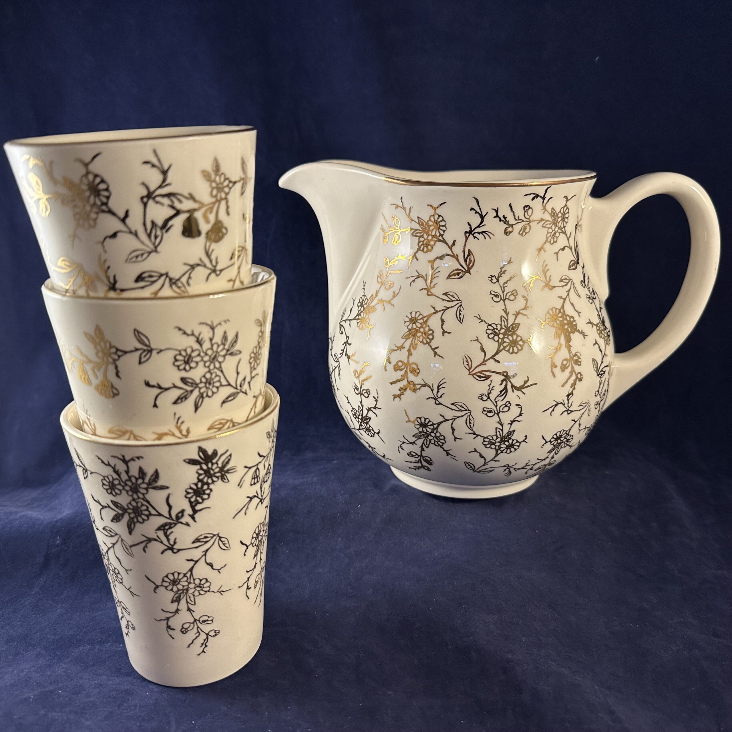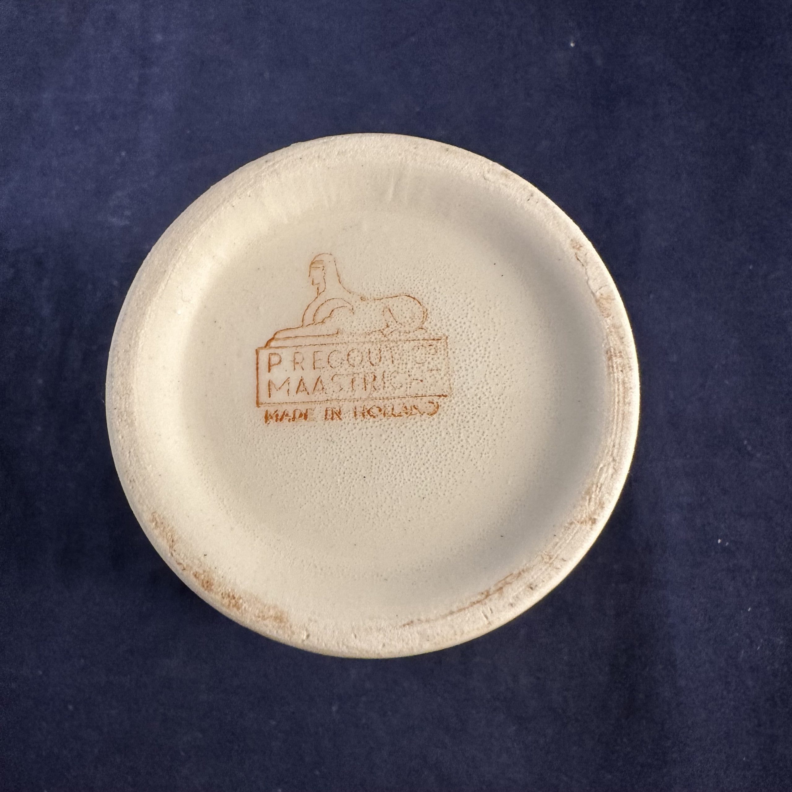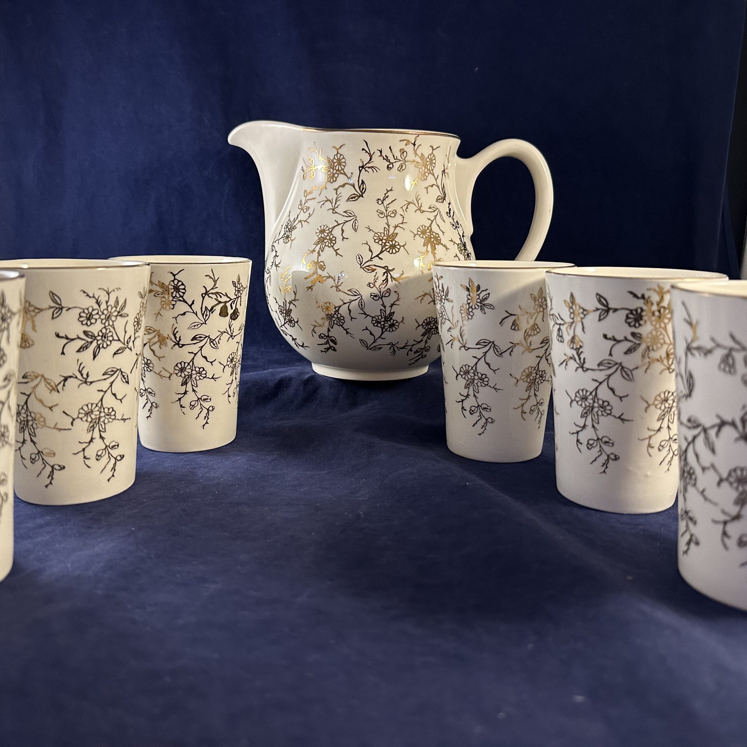 Petrus Regout melkkan Ø 11 cm hoog 16 cm met 6 bekers hoog 10,4 cm. Ø 7,5 cm.