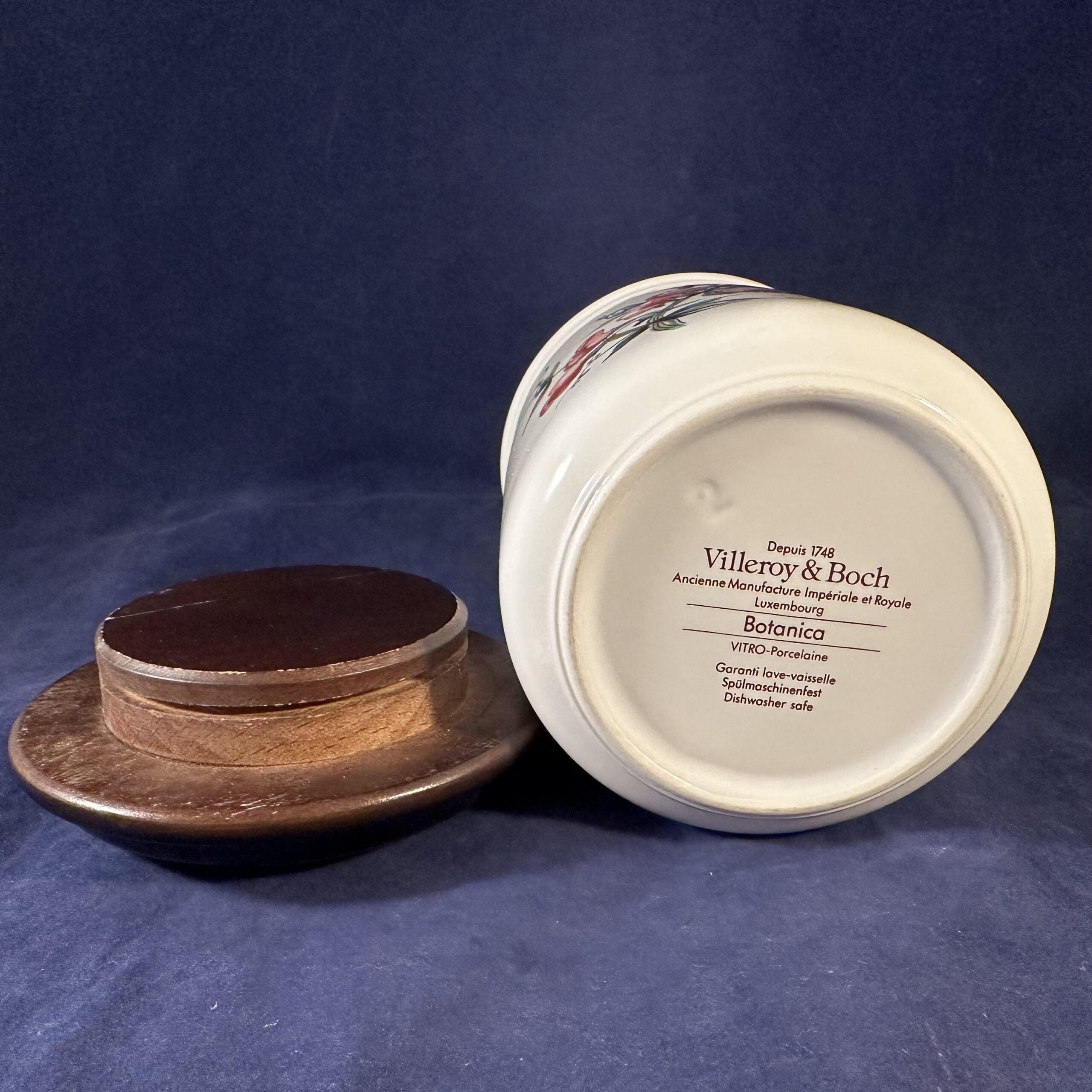 Villeroy en Boch Botanica voorraadpot met houten deksel, hoog 14 cm, ‘Lathyrus tuberosus’ Het dekseltje heeft geen afdichtring meer.