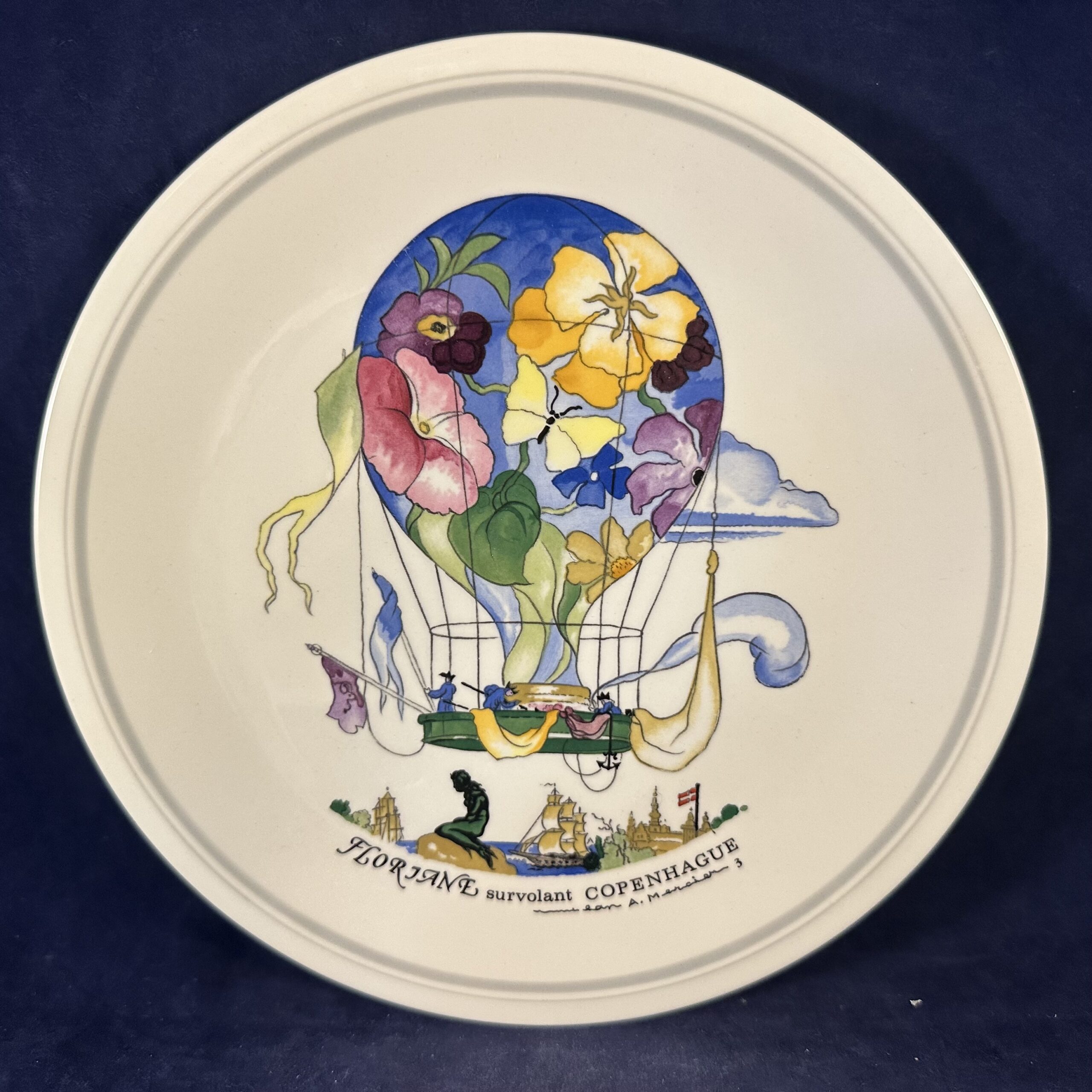 Ontbijtbord uit de Le Ballon-serie van Villeroy & Boch uit het einde van de 20e eeuw, met ontwerpen van Jean Mercier’s beroemde aquarellen van heteluchtballonnen boven verschillende internationale steden. Dit is het decor ‘Le Ballon’ ontbijtbord Ø 20 cm, decor Floriane Copenhagen.