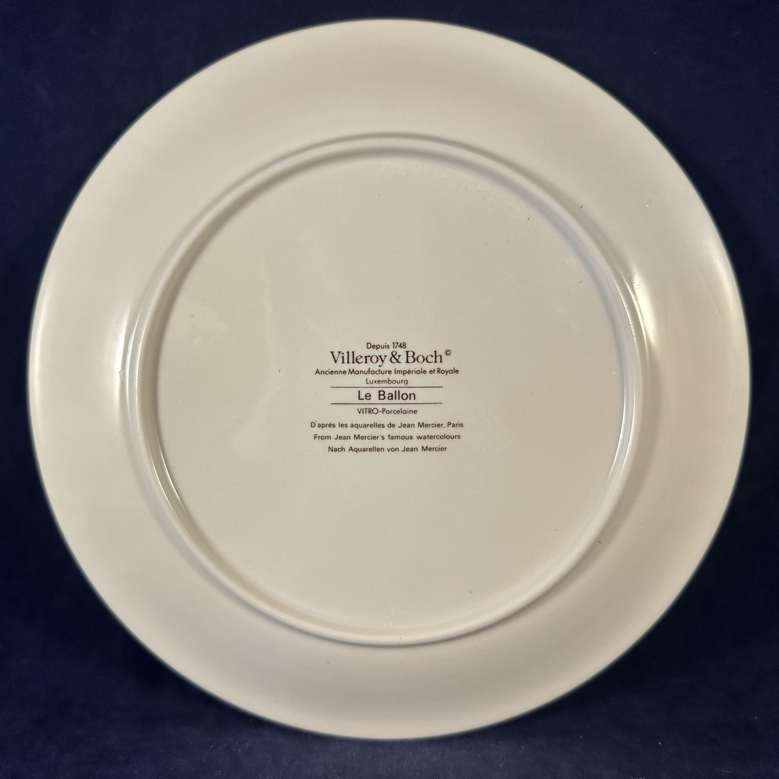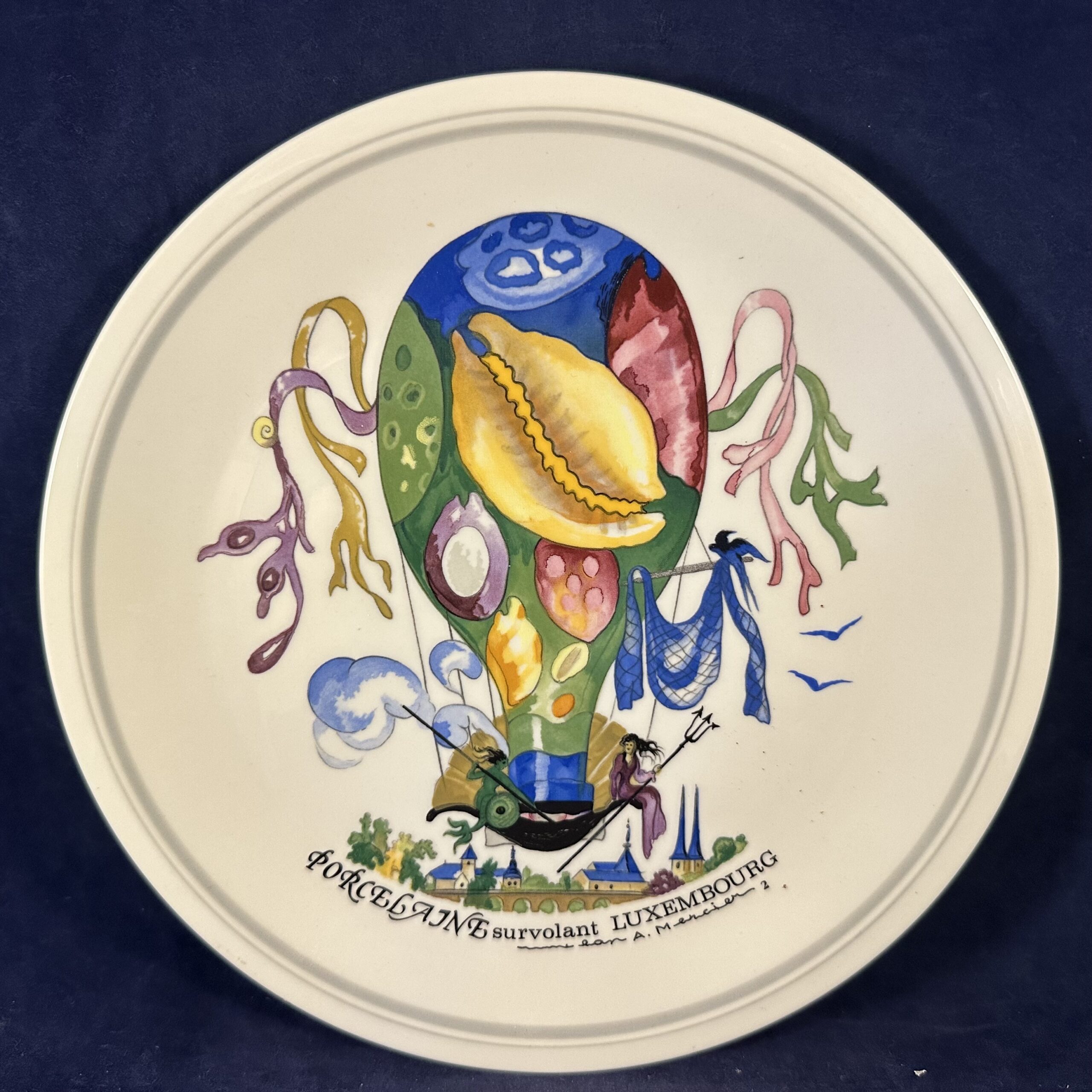 Ontbijtbord uit de Le Ballon-serie van Villeroy & Boch uit het einde van de 20e eeuw, met ontwerpen van Jean Mercier’s beroemde aquarellen van heteluchtballonnen boven verschillende internationale steden. Dit is het decor ‘Le Ballon’ ontbijtbord Ø 20 cm, decor porselein Luxemburg.